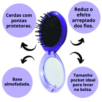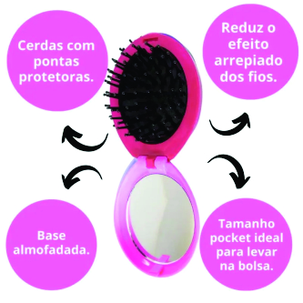 Com design moderno e espelho integrado, permite desembaraçar os fios com facilidade e dar aquele retoque rápido sempre que precisar. Suas cerdas flexíveis ajudam a reduzir o frizz e proporcionam mais conforto ao pentear.