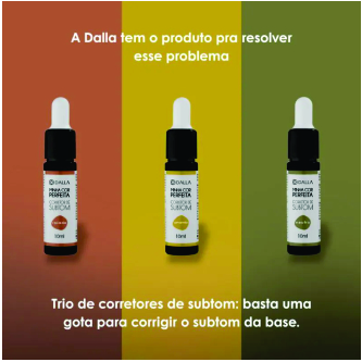 O Trio Corretores de Subtom Dalla – Minha Cor Perfeita é um kit com 3 bisnagas (10 mL cada) que permite ajustar o subtom da sua base ou corretivo. Ele corrige bases que estão amarelas, rosadas ou alaranjadas demais, para você alcançar o tom ideal da sua pele.